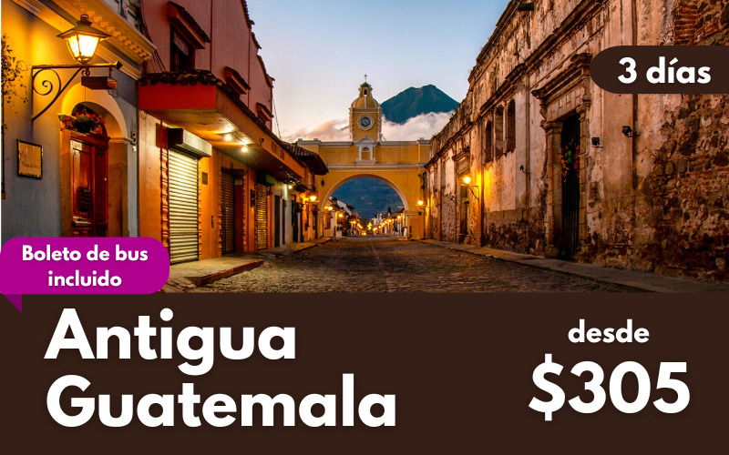 Sumérgete en el encanto colonial de Antigua Guatemala con este paquete de 3 días y 2 noches. Recorre calles empedradas, iglesias centenarias y mercados llenos de color en una ciudad declarada Patrimonio de la Humanidad. Ideal para una escapada cultural con paisajes volcánicos y arquitectura histórica. Perfecto para desconectar y redescubrir la belleza del pasado.
